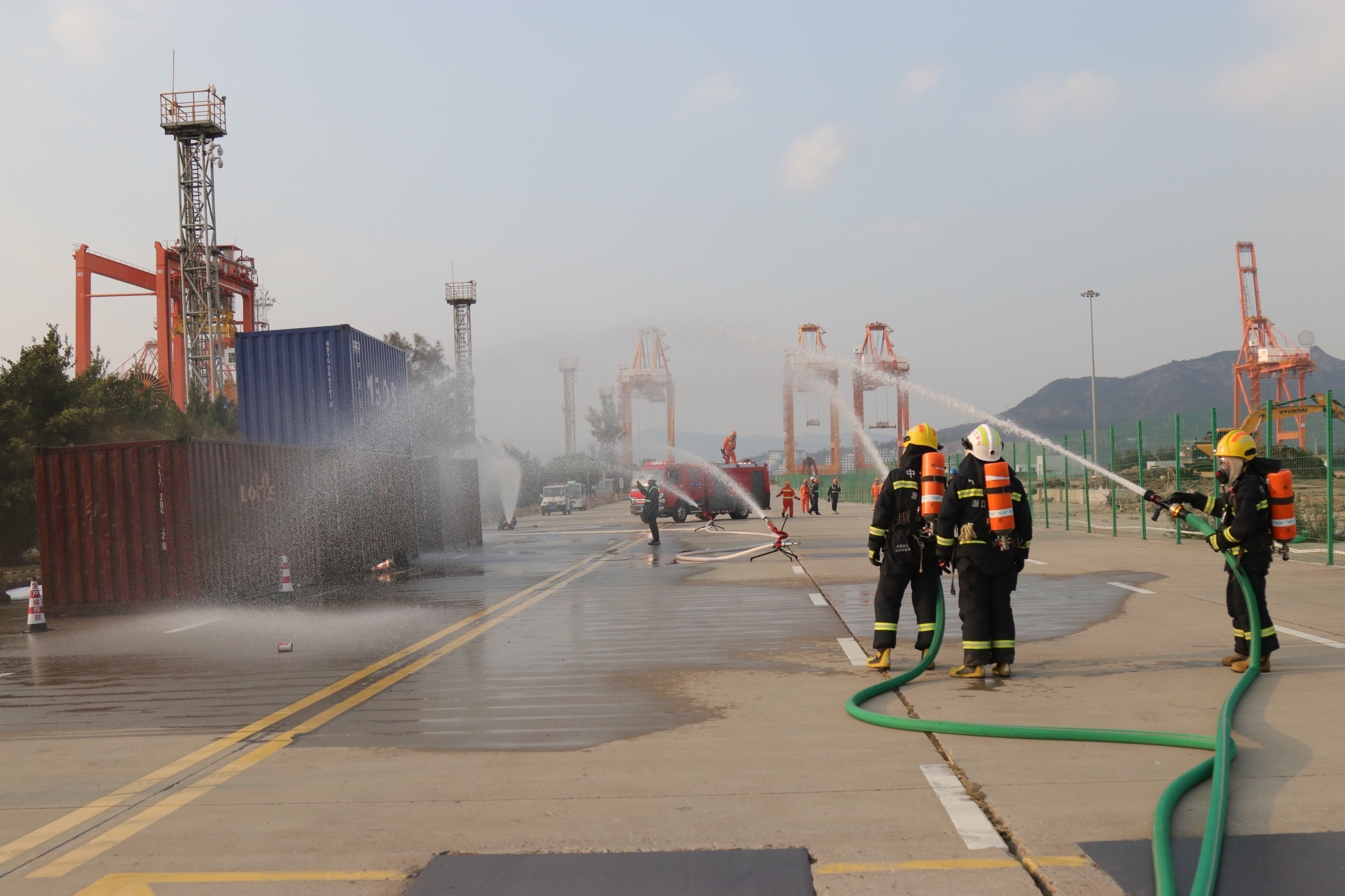 演练以集装箱内锂电池自燃起火发生火灾为模拟场景,状元岙公司立即启动应急响应,第一时间联动属地消防救援局并调取箱内货物信息的MSDS资料予以通报,同时协调指挥港区志愿消防队赶赴现场,迅速布设喷淋水炮并利用自有消防车车载水炮对着火的锂电池车集装箱及周边相邻集装箱箱体持续进行喷淋降温灭火。各应急小组按既定预案高效、快速落实各自职责,有序做好现场人员引导疏散、区域警戒隔离、火场温度、气体监测及外部支援力量的引导。